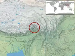 Es endémica de los montanos del sudeste del Tíbet. Su rango altitudinal oscila alrededor de 910 m s. n. m..