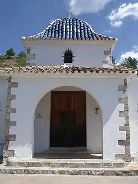 El acceso al templo se hace a través de una sencilla puerta de madera, adintelada, con mirillas, que permiten ver el altar mayor cuando la ermita permanece cerrada; situada en un porche delantero abierto con tres arcos de medio punto, al que se accede subiendo dos escalones.[2]