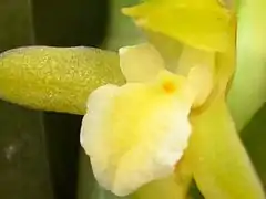 Es una orquídea de tamaño pequeño a mediano, que crece con hábitos de epifita y con un rizoma alargado entre cada pseudobulbo oval, aplanado que está envuelto basalmente por hojas y vainas laterales y que llevan una sola hoja apical, lineal que es conduplicada abajo. Floraciones en casi cualquier época del año con flores individuales, de 3,75 cm de largo, envueltas la inflorescencia basal por 2 a 3 vainas infladas.[1]