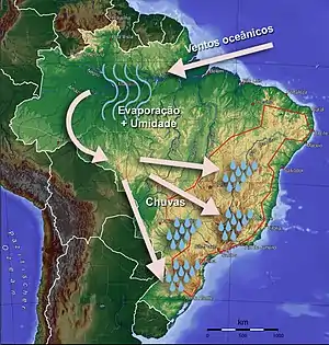 La Amazonía tiene un papel destacado en la regulación del clima en todo Brasil y otras regiones de América del Sur. Su bosque es un importante sumidero de carbono y es fundamental para la formación de las lluvias que riegan gran parte del país.[11] Del 30% al 50% de la lluvia en la cuenca del Amazonas se origina en el propio bosque a través de la evaporación. Además, la humedad originada en la cuenca amazónica es transportada por los vientos a otras partes del continente y se considera importante en la formación de precipitaciones en regiones distantes de la propia Amazonía.[12] Naturalmente, si el bosque desaparece, las lluvias desaparecerán. Se crea un círculo vicioso en el que si la deforestación supera un cierto nivel crítico, estimado en alrededor del 40% de las pérdidas, el bosque no podrá generar suficiente lluvia para mantenerse: cuanto menos bosque, menos precipitación, y menos precipitación, el menos bosque. Aproximadamente el 19% de la selva amazónica ya se ha perdido,[13] y estudios recientes indican que está cerca de pasar el punto crítico, más allá del cual su degradación se volverá irreversible.[13][14][15][16] Además de los problemas en la Amazonía, todos los demás biomas nacionales - el Cerrado, el Semiárido, el Pantanal, la Mata Atlántica y la Pampa - también sufren efectos importantes, la mayoría de ellos con tendencia creciente, contribuyendo a amplificar la cascada de efectos.[17][18][19][20][21][22][23][24][25]