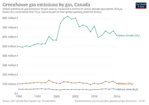 El cambio climático es el resultado de la emisión de gases de efecto invernadero, que son producidos por la actividad humana. Canadá es actualmente el séptimo país del mundo que más gases de efecto invernadero emite.[3] En 2018, de todos los países del G20, Canadá fue el segundo en emisiones de gases de efecto invernadero per cápita, después de Arabia Saudí.[4] De hecho, en 2018, Canadá vertió un total de 729 millones de toneladas de dióxido de carbono equivalente (MT CO2eq). Esto representa un minúsculo descenso respecto a las 730 MT CO2eq de 2005, pero un gran aumento respecto a las 602 MT CO2eq de 1990.[5]