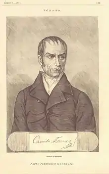 Camilo Torres Tenorio (Popayán, 22 de noviembre de 1766-Bogotá, 5 de octubre de 1816) fue un abogado, intelectual, y político colombiano, que encabezó el movimiento de la primera independencia de la Nueva Granada, hoy Colombia, de la cual fue presidente. Por su capacidad oratoria, pasó a la historia como El Verbo de la revolución.político y patriota colombiano. Cuarto hijo (primer varón) de una familia de nueve hermanos, fue su padre el español Francisco Jerónimo de Torres, comerciante, minero y propietario de vastas extensiones territoriales al sur de Neiva, en la costa del Pacífico y en Popayán, casado con la payanesa María Teresa Tenorio.
