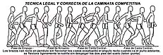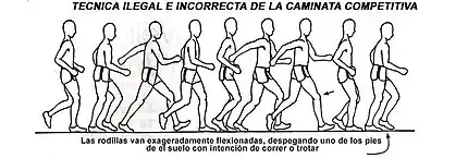 - La regla fundamental de la Caminata Competitiva exige el contacto permanente con el suelo, solo se permitirá la flexión de la rodilla en la fase de arrastre y en la fase de empuje siempre y cuando esta no sea exagerada mayor en una apertura no menor de 165.º, con caídas de pies en línea paralela y no en línea recta, sin que el caminante diese la impresión de ir corriendo o trotando.
