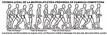 - El artículo 230 del Reglamento de la IAAF define la marcha atlética así: “La marcha atlética es una progresión de pasos de manera tal que el deportista se mantenga en contacto con el suelo, a fin de que no se produzca pérdida de contacto visible (a simple vista). La pierna que avanza tiene que estar recta, es decir no doblada en la rodilla, desde el momento del primer contacto con el suelo hasta que se halle en posición vertical”.