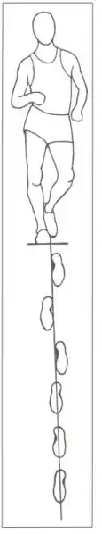 - En la caminata la sucesión de pasos van en línea paralela, es decir, los pies van cayendo de manera sucesiva en dos líneas imaginarias ya que el movimiento de la cadera no es prolongado y va en una oscilación de unos 35.º aproximadamente de balanceo.