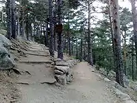 Unos metros más abajo se llega a la Carretera de la República, hoy convertida en pista forestal, que sube desde la Pradera de los Corralillos pasa por Navarrulaque y termina en el puerto de la Fuenfría. El camino prosigue cruzando la carretera en descenso, adentrándose en el pinar. El itinerario discurre por un trazado con mayor pendiente. Algo más abajo se suaviza y tras largas vueltas y revueltas desemboca otra vez en la pista forestal citada anteriormente.