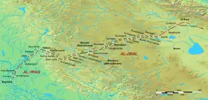 El primer asentamiento después de Bagdad era Nahrauán o Jisr Nahrauán («Puente de Nahrauán»), así llamado en honor del gran canal de Nahrawan que cruzaba la localidad. En el periodo abasí era una población próspera, pero fue posteriormente abandonada cuándo la carretera se movió al norte a Baquba. El distrito circundante fue llamado Ṭarīq-i-Khurāsān.[4] La siguiente ciudad era Daskarah al-Malik («Daskara del Rey»), se identifica con la Dastagird sasánida. Le seguía Jalula, cercana a un puente sasánida que cruzaba el río Diala, Janiqin, también sitio de un puente importante, y Qasr Sjirin, el «Castillo de Shirin», así llamado en honor de la esposa del sah Cosroes II.[5] En Hulwán, la carretera dejaba la llanura mesopotamia y se adentraba en los montes Zagros y la provincia de Yibal.[6] La carretera continuaba hacia Madharustán y finalmente alcanzaba el paso de Hulwán, la ciudad de Kirind y el pueblo de Jushan. Entonces seguía a Tazar, también llamada Qasr Yazid, y al-Zubaydiya, donde la carretera viraba hacia Kirmanshah y atravesaba la llanura de Mayidasht. La mayoría de estas localidades contaron con palacios sasánidas, según los geógrafos musulmanes.[7] Desde Kermanshah la carretera seguía a Hamadán y Sivah, viraba al norte hasta Rayy y desde allí entraba a la provincia de Qumis.[8] La carretera era el principal acceso a Qumis y la mayoría de las ciudades de la provincia se localizaban a lo largo de su curso: Juwar, Qasr o Qariyat al-Milh (el «Castillo de la Sal»), Ras al-Kalb («la cabeza del perro», identificable con Lasgird), Semnán, Damghan, al-Haddadah («La Forja») o Mihman-Dust, y Bistam. Cerca de esta, en el pueblo de Badhash, la carretera alcanzaba Jorasán.[9]