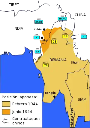 En Imfal, el IV Cuerpo Indio se encontraba rodeado por las 15.ª y la 33.ª divisiones japonesas. Sin embargo, tanto Imfal como Kohima eran abastecidas desde el aire.[4]