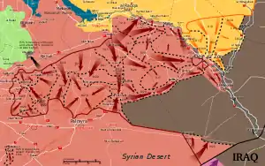 El 14 de julio de 2017, el Ejército sirio lanzó una ofensiva en el sur de la provincia de Raqa provincia, avanzando al sur de la ciudad de Resafa[38] a 70 kilómetros de Sukhnah después de alcanzar la frontera administrativa de Homs. Entre el 15 y 16 julio, varios pozos petrolíferos y campos gasíferos fueron capturados por el ejército.[39] El 18 julio, las SAA empujaron a Estado Islámico fuera de las partes occidental y suroccidental de la provincia de Raqqa, alcanzando las afueras de las montañas Bishri.[40][41]