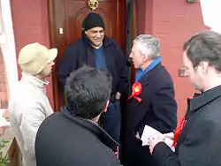 Jack Straw haciendo campaña puerta a puerta con concejales de Blackburn.