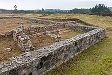 El recinto fue construido entonces, en un altiplano de 480 metros sobre el nivel del mar, rodeado por una pequeña cadena montañosa, cerca del río Cabalar. Tenía una muralla perimetral de 172 x 140 metros, con las esquinas redondeadas, y un foso externo que complementaba las funciones defensivas de la muralla. La extensión del campamento era de 2,4 hectáreas. Existían además cuatro puertas de acceso al campamento, y varias torres de vigilancia. En el interior había dos edificios principales. Uno de ellos era la Principia (cuartel general), de planta casi cuadrada, que medía 29,5 x 29,6 metros. Al lado de la Principia estaba el Praetorio (residencia del comandante) de 38 x 29,6 metros. Los dos edificios estaban separados por una amplia calle. El resto de los edificios serían barracones, sanitarios, cuadras para los animales y una cantina.