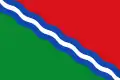 «Bandera rectangular de proporciones 2:3, formada por tres franjas ondadas diagonales del ángulo superior del asta al inferior del batiente, dos azules y una blanca central, siendo al parte del asta verde y roja la del batiente»
