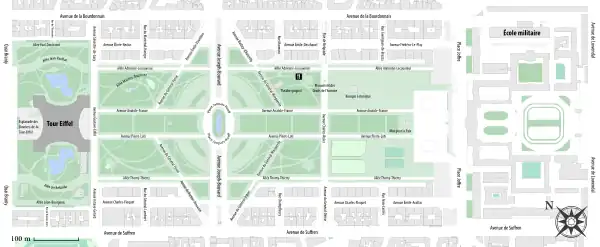 Vías adyacentes avenida Charles Floquet (SE), quai Branly (NO), plaza Joffre (SO) y avenidas Elisée Reclus, Emile Deschanel y Fréderic le Play (NE)