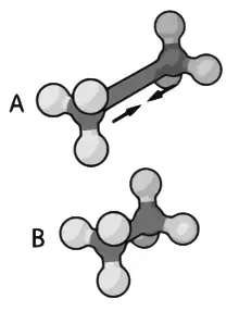 Donde es la constante del resorte, es la longitud del enlace y es la longitud del enlace entre los átomos y cuando todos los otros términos en el campo de fuerza involucrado valen cero. Este último término usualmente es nombrado "longitud de enlace al equilibrio", lo que puede causar confusión. La longitud de enlace al equilibrio es el valor adoptado al equilibrio a 298 K con todos los demás términos del campo de fuerza y energía cinética presentes. Entonces, suele ser apenas diferente del valor de la longitud del enlace en los experimentos a 298 K.[4]