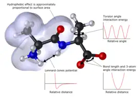 Los tipos de átomos se definen para diferentes elementos así como para los mismos elementos en entornos químicos diferentes. Por ejemplo, los átomos de oxígeno en el agua y en el grupo funcional carbonilo son clasificados como diferentes tipos de campos.[14] Los conjuntos de parámetros típicos incluyen valores para la masa atómica, carga iónica, parámetros de Lennard-Jones para cada átomo así como valores al equilibrio de longitudes de enlace, ángulos de enlace y ángulos diedro.[15] Los términos de enlace se refieren a pares, tripletes y cuadrupletes de átomos enlazados e incluyen valores para la constante del resorte efectiva para cada potencial. Los parámetros más recurrentes utilizan un modelo de carga fija que supone que cada átomo posee únicamente un valor asignado para la carga atómica que no se ve afectado por el ambiente electrostático local.[12][16]