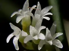 Es una orquídea de hábitos epífitas, monopodial con tallo muy ramificado y hojas cilíndricas alargadas, cuyas inflorescencias brotan de la base del tallo en el nodo opuesto de la hoja. Las flores son pequeñas, blancas, los sépalos y pétalos libres, y nectario en la parte posterior del labio. Pertenece a la especie de la sección Campylocentrum con largas y robustas hojas cilíndricas.[1]
