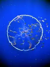 La transparencia es muy común y dominante en los animales que se encuentran en mar abierto, especialmente aquellos que viven en aguas relativamente profundas. Se encuentra en el plancton, así como en animales más grandes, ya sea en medusas, salpas (tunicados que flotan) y Ctenophora.[5] Muchos animales marinos que flotan cerca de la superficie tienen un alto nivel de transparencia, lo que hace que tengan un camuflaje casi perfecto.[5] Sin embargo, la transparencia es difícil para los cuerpos que están hechos de materiales que tienen diferentes índices refractivos al del agua de mar. Algunos animales marinos como las medusas tienen cuerpos gelatinosos compuestos principalmente de agua; su mesogloea es acelular y muy transparente, lo que hace que puedan flotar pero también las hace grandes para su masa muscular, por lo que no pueden nadar rápido.[5] Los animales gelatinosos tienen entre 50 y 90% de transparencia. Una transparencia del 50% es suficiente para hacer invisible a un animal de su depredador (peces Gadus) a una profundidad de 650 metros (2132,545935 pies); para ser invisible en aguas menos profundas se requiere un mayor porcentaje de transparencia ya que la luz es mejor y los depredadores pueden ver mejor. Por ejemplo, un Gadus puede ver a una presa que tenga 98% de transparencia, si la luz es óptima en aguas poco profundas. Por lo tanto, la transparencia es mucho más efectiva en aguas más profundas.[5]