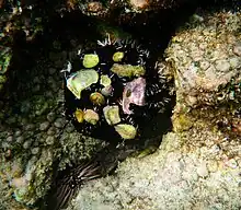 De manera similar, los erizos de mar usan sus pies de tubo para recoger los desechos del fondo y ponerlos en su superficie. Usan caparazones, piedras, algas y a veces anémonas de mar.[16]