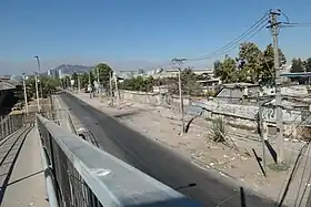 ![]() El canal La Punta corre ahora entubado bajo el lado sur de la calle Bravo de Saravia en Santiago de Chile. La foto esta tomada desde la pasarela peatonal sobre la ruta 5 mirando en dirección al este, donde se ve el cerro San Cristóbal y otros. Antiguamente, en los 1970s, el canal corría a tajo abierto por el lado sur de la calle. | ||