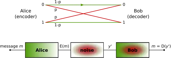 Donde 0 ≤ p ≤ 1/2. Si p>1/2 entonces el receptor obtendría los bits contrarios (interpretar un 1 cuando se recibe un 0, y viceversa), obteniéndose un canal equivalente con probabilidad de fallo 1-p ≤ 1/2.