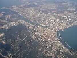 ![]() Le canal de Caronte vu du ciel (à gauche : la Méditerranée et à droite : l'Étang de Berre et Martigues) | ||