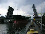 El puente levadizo Gropbron permitiendo acceso a un buque al Canal Karls grav.