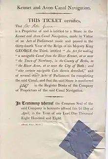 Los planes para una habilitar una vía nevegable fluvial se archivaron hasta principios del siglo XVIII. Sin embargo, en 1715, se autorizó el trabajo para hacer navegable el río Kennet desde Reading hasta Newbury. El trabajo comenzó en 1718, bajo la supervisión del topógrafo e ingeniero John Hore de Newbury. En 1723, a pesar de la considerable oposición local, se abrió a la navegación el río Kennet, que comprende tramos de cauce natural que se alternan con 11 millas (17,7 km) regulados por esclusas creadas artificialmente.[3]