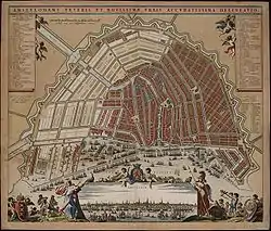 Gran parte del sistema de canales de Ámsterdam es fruto de una buena planificación urbana de la ciudad. En la primera parte del siglo XVII, con el aumento de la inmigración, se elaboró un plan integral en el que se establecían cuatro canales semicirculares concéntricos cuyos extremos desembocaban en la Bahía del IJ. Conocido como el Grachtengordel (Cinturón de Canales),[6] tres de los canales estaban destinados en gran parte al desarrollo residencial (el Herengracht o Canal de los Señores; el Keizersgracht o Canal del Emperador; y el Prinsengracht o el Canal del Príncipe); y un cuarto canal, el exterior, Singelgracht o Canal Periférico (actuales calles Nassaukade y Stadhouderskade), para fines de defensa y gestión del agua. Están construidos con bordes u orillas de tierra apisonada o cantería, siempre armados para ser más resistentes con olmos o ulmus, árbol de raíz primaria o pivotante muy fuerte que actúa como un pilote. El plan también preveía la interconexión de los canales a lo largo de los radios; la creación de un conjunto de canales paralelos en el barrio de Jordaan (principalmente para el transporte de mercancías, como la cerveza); la conversión de un canal perimetral interno ya existente (el Singel), con fines defensivos, en un canal orientado al desarrollo residencial y comercial; y la creación de más de un centenar de puentes. El propósito defensivo de las calles Nassaukade y Stadhouderskade se consiguió mediante la construcción de un foso y diques de tierra, con puertas en los puntos de tránsito pero sin superestructuras de mampostería.[7][8]
