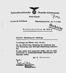 Después de la huida de Rudolf Hess al Reino Unido para buscar negociaciones de paz con el gobierno británico el 10 de mayo de 1941, Hitler abolió el cargo de Designado adjunto del Führer el 12 de mayo de 1941. Hitler asignó los antiguos deberes de Hess a Bormann, con el título de Jefe de la Parteikanzlei (Cancillería del partido). En este puesto, era responsable de todos los nombramientos del NSDAP y solo respondía ante Hitler. La Cancillería del Partido también estaba al tanto de la extrema violencia que las Fuerzas Especiales de las SS llevaban a cabo en el teatro oriental en el verano y el otoño de 1941, cuando el jefe de la Gestapo, Heinrich Müller, distribuyó informes, que fueron firmados por altos funcionarios de todo el Reich. Heydrich compartió las cuestiones legales y administrativas que rigen los asuntos jurisdiccionales relacionados con la Conferencia de Wannsee con las organizaciones del Partido, incluida la Cancillería del Partido de Bormann a fines de enero de 1942, haciéndolos cómplices de la orquestación de la Solución Final.