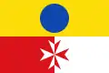 Paño de proporción 2/3, la mitad superior amarilla, con un disco azul en su centro; la mitad inferior dividida verticalmente en dos mitades, roja al asta y blanca al batiente, con una cruz de Malta, centrada en la divisoria, blanca en el campo rojo y roja en el blanco. Esta bandera también se editó en el año 2006.