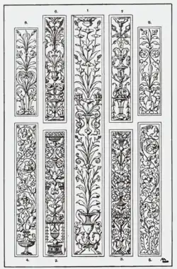 Esta decoración en la península ibérica se fue alargando durante los estilos plateresco y barroco, llamado también «zarcillo de acanto», aunque el acanto natural no echa zarcillos, las flores y cálices que se encuentran a menudo en esta ornamentación son casi siempre parecidas al perfil de una hoja de acanto pero con un diseño muy libre por parte del autor; suele estar realizada en plafones rectangulares y con un centro conformado por una copa o candelabro y en los lados la decoración es simétrica.[4]