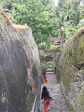 El templo tiene 315 escalones de roca, en descenso, enmarcados por paredes de piedra, a orillas del río sagrado Pakerisan. Sus relieves, cincelados en nichos que los protegen, en la cara del acantilado, imitando fachadas de templos. Al llegar al complejo existen dos grupos de templos separados por el río. El primer grupo está ubicado al oeste del río y consta de cuatro santuarios, una fuente y un estanque para baño. Se cree que se corresponden con cuatro tumbas de reinas menores o concubinas de Anak Wungsu. También existe una especie de sala de una ermita, una vihara que probablemente albergara a los cuidadores de las tumbas.[4]