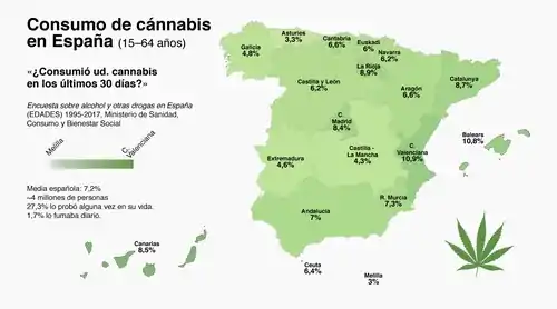 Se trata de la droga ilegal más consumida en España; en el informe EDADES de 2017, un 9.1% de los encuestados entre 15 y 64 años dijo haber fumado cannabis en los últimos 12 meses, y un 1.9% lo fumaba diario,[12] siendo en su mayoría hombres (70%) y la media de edad ~34 años;[13] El 35% de los encuestados dijo haber probado alguna vez esta droga. Existe una fuerte tolerancia social con la marihuana; en una encuesta del CIS de 2018, un 84% de los encuestados estaba a favor del cannabis medicinal, y un 47% a favor de ambos, medicinal y recreativo (el 41% lo rechazó).[14] En el informe europeo ESPAD 2019, el 23% de los estudiantes españoles dijo haber probado la marihuana alguna vez en su vida.[15] El 12% consumió en los últimos 30 días, siendo el tercer país de la UE en el ranking, tras Italia y Francia (media europea 15%).[16]