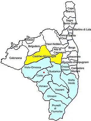 En aplicación del Decreto n.º 2014-255[2] de 26 de febrero de 2014, el cantón de Castifao-Morosaglia fue suprimido el 22 de marzo de 2015 y sus 10 comunas pasaron a formar parte del nuevo cantón de Golo-Morosaglia.