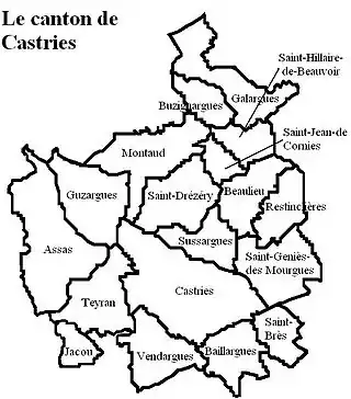 En aplicación del Decreto nº 2014-258[2] de 26 de febrero de 2014, el cantón de Castries fue suprimido el 22 de marzo de 2015 y sus 18 comunas pasaron a formar parte; diez del nuevo cantón de Le Crès, seis del nuevo cantón de Saint-Gèly-du-Fesc, una del nuevo cantón de Lunel y una del nuevo cantón de Montpellier-Castelnau-le-Lez.