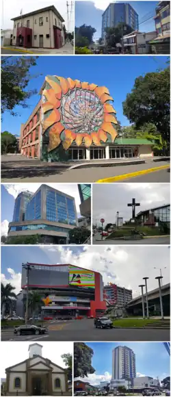 De arriba abajo, de izquierda a derecha: Municipalidad de Montes de Oca, Condominio Emperador, Escuela de Estudios Generales de la Universidad de Costa Rica, Torre del Este, Cristo de Sabanilla, Mall San Pedro y Rotonda de la Hispanidad, Parroquia San Ramón Nonato, Torre Latitud Los Yoses.