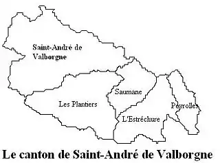 En aplicación del Decreto n.º 2014-232[2] de 24 de febrero de 2014, el cantón de Saint-André-de-Valborgne fue suprimido el 22 de marzo de 2015 y sus 5 comunas pasaron a formar parte del nuevo cantón de Le Vigan.