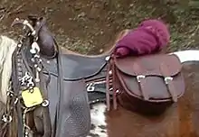 En la equitación, las cantinas se colocan en varias posiciones, en la parte trasera,[2] lateral o delantera de la silla. La mayoría se sujetan al sillín con correas y lazos. Se pueden hacer de varios materiales. Aunque el cuero era el material tradicional, es más pesado y requiere más mantenimiento que muchas versiones modernas. Hay varios tipos: bolsas con pomo (que se colocan frente a la silla), cantinas tradicionales en pares (que se colocan en las caderas del caballo, a ambos lados del borrén trasero) y bolsas más pequeñas variadas, como una cantina de borrén (un pequeño bolsa en forma de tubo que se coloca justo detrás de la silla de montar), o una sola bolsa de silla de montar pequeña que se puede llevar en el lado externo (lado derecho) de una silla de montar inglesa .