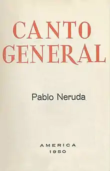 Canto general es el décimo poemario de Pablo Neruda, premio Nobel de literatura chileno, publicado por primera vez en México, en los Talleres Gráficos de la Nación, en 1950, y que empezó a componer en 1938. Con pocas semanas de diferencia, se imprimió y circuló en Chile una versión clandestina, con pie de imprenta ficticio (Imprenta Juárez, Reforma 75, Ciudad de México), a cargo de Américo Zorrilla y del ilustrador José Venturelli. La edición original que salió en México incluyó ilustraciones de los muralistas mexicanos Diego Rivera y David Alfaro Siqueiros.