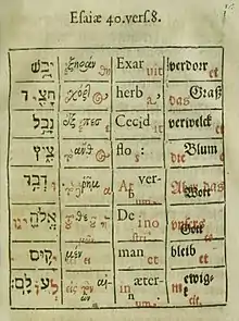 Capítulo 40 de Isaías, Versículo 8 en hebreo, griego, latín y alemán, con el versículo analizado palabra por palabra. En español, este Versículo se traduce "La hierba se seca y las flores se caen, pero la palabra de nuestro Dios permanece para siempre." (de Elias Hutter, 1602)