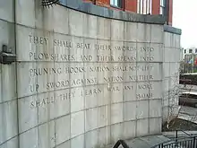 "...convertirán sus espadas en rejas de arado y sus lanzas en podaderas: No alzará espada nación contra nación, ni se adiestrarán más para la guerra." ~ Isaías 2:4 (Versículo de la Biblia frente a la Edificio de las Naciones Unidas en Nueva York)