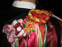 En la espalda se fijan en rosetones las denominadas cintas de tuna o tuno recibidas como regalo y dedicatoria por parte de alguna dama que quiere dejar un recuerdo suyo en agradecimiento por algún hecho que deba ser recordado.