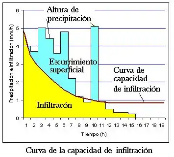 En la figura anexa se puede ver la curva de la capacidad de infiltración, variable en el tiempo, sobrepuesta a un pluviograma horario, gráficamente se muestra el escurrimiento superficial, también variable en el tiempo.