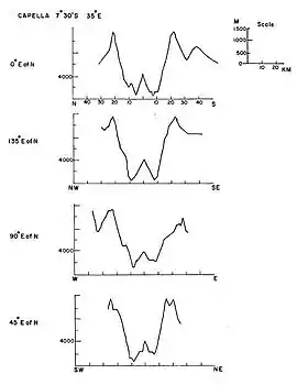 La pared de Capella es baja, pero relativamente gruesa e irregular, con un gran promontorio insertado en el lado sur-oriental. El cráter está atravesado por una grieta profunda, el Vallis Capella, que pasa directamente a través de Capella desde el borde norte hacia el lado sureste de la pared, y se extiende a ambos lados a una distancia total de 110 kilómetros. Este se formó a partir de una cadena de cráteres. En el medio del cráter aparece un amplio pico de base redonda, con un pequeño cráter en la parte superior. El lado occidental del cráter está salpicado de restos del impacto, formando racimos de pequeñas colinas.