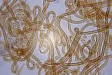 El capilicio es una red de fibras que rodea a las esporas. En la figura, el mixomiceto Hemitrichia calyculata.