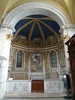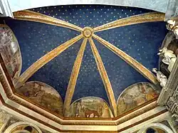 La bóveda estaba decorada con delicados motivos all'antica antes de ser cubierta con una alfombra azul y estrellas doradas debido a su mal estado. En los lunetos hay cinco frescos de la Vida de San Jerónimo, desprendidos y trasladados al lienzo en el siglo XVIII. Las escenas son: