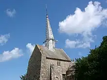 En el exterior lo más destacable es una maciza torre coronada por una aguja de madera y plomo con una fuerte inclinación, así como un recinto parroquial con un púlpito exento.