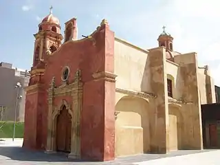 Es un templo de planta de cruz latina con una sola nave y cúpula en el crucero. Su fachada principal mira hacia el norte y posee una sola torre con campanario en el lado oriental, cuya cúpula estuvo recubierta por azulejos. Por los costados este y oeste, la iglesia está reforzada por contrafuertes. Fue construida con piedra volcánica y en su erección participaron artistas indígenas.
