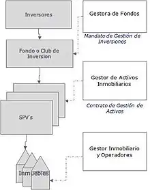 Las inversiones son realizadas habitualmente a través de fondos de capital privado inmobiliarios, que son estructuras de inversión colectiva, que agrupan capital de diferentes inversores. Estos fondos habitualmente tienen una duración de diez años distribuidos en 2-3 años de inversión, durante los cuales se realizan las adquisiciones de activos, y unos periodos de gestión de los activos en los que mediante una gestión activa se crea valor hasta que finalmente este es realizado durante los últimos dos años, habitualmente llamados periodo de liquidación.