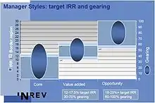 - Core y Core Plus: Es una estrategia de ratios riesgo/rentabilidad moderados. El fondo habitualmente invertirá en propiedades "core" aunque algunas de ellas requerirán ciertas mejoras. Por propiedades core, nos referimos a aquellos inmuebles bien ubicados, de construcción reciente y con un alto nivel de ocupación de inquilinos cuya calidad crediticia sea alta. La rentabilidad en estas inversiones es obtenida principalmente por unos ingresos recurrentes de alquileres y una baja plusvalía cercana a la inflación.